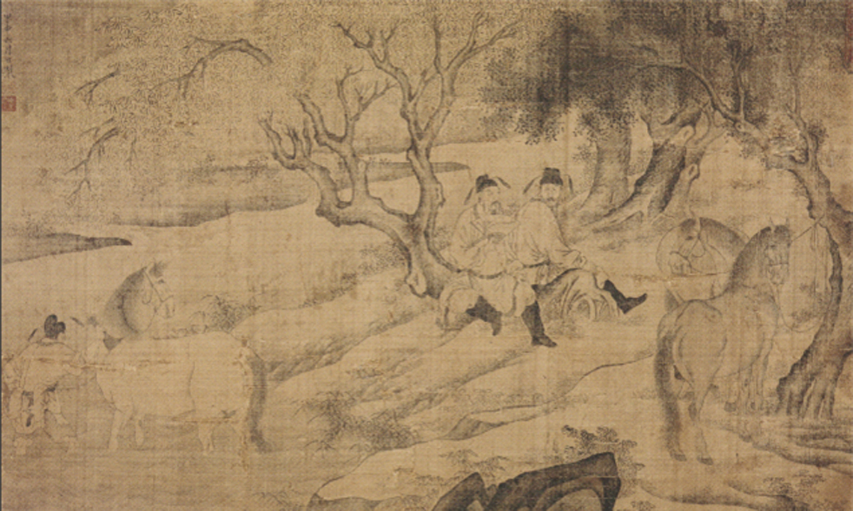 인물은 정밀하고 자세하게 표현됐다. 강가에서 쉬고 있는 관리들, 나무에 매어진 말들, 강에서 마부가 말을 씻는 장면 등 세 그룹으로 따로 떨어진 요소가 한 화면에서 자연스럽게 통합돼 있다.