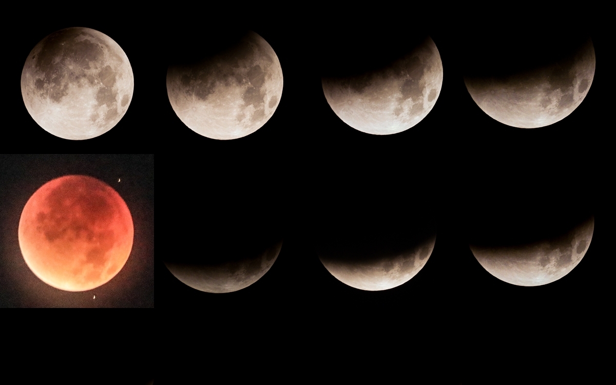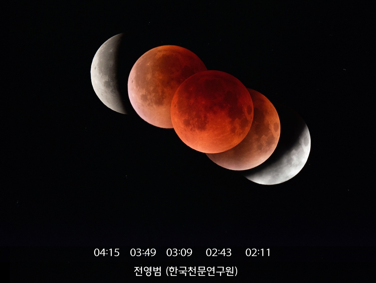 이날 오전 1시16분 달이 지구 그림자에 가려지기 시작했다. 2시30분 완전히 그림자 속으로 들어갔고, 달이 지구 그림자에 가장 깊게 들어가는 ‘최대식’은 오전 3시11분이었다. 개기식은 3시53분 종료됐다.