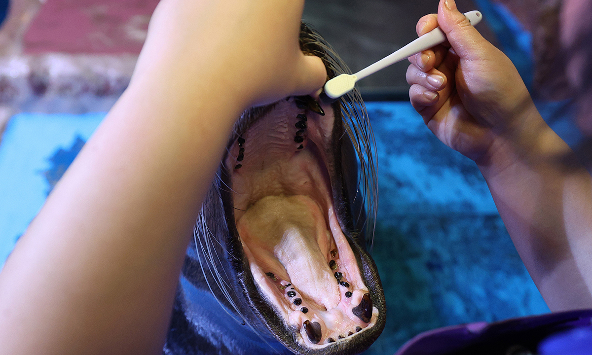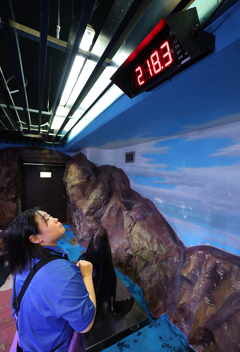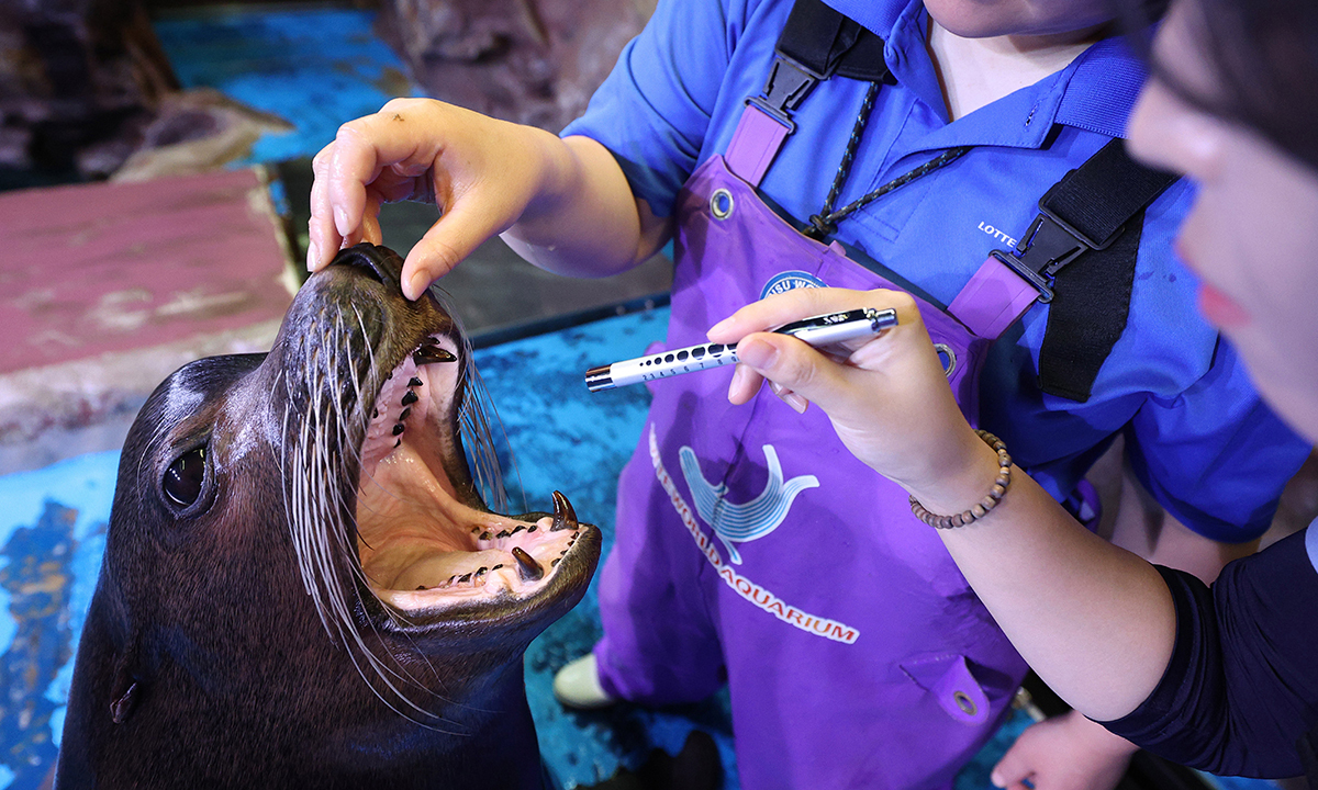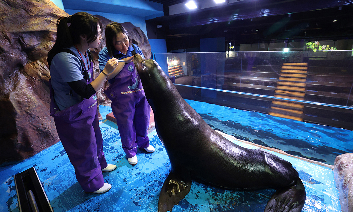 바다사자 수조에서는 8년 차 해양포유류 담당 박지원(29) 아쿠아리스트가 수컷 캘리포니아 바다사자 ‘데니스’(13)의 건강검진을 진행하고 있었다. 박씨가 이름을 부르며 손짓하자 데니스는 곧장 체중계 위로 올라갔고, 체중 측정에 이어 안구·구강 검진, 초음파, 채혈 훈련이 이어졌다. 박씨는 “아기들도 주사를 맞으면 아프듯 바다사자도 마찬가지”라며 “아쿠아리스트와의 신뢰와 교감을 바탕으로, 놀이와 보상을 활용한 메디컬 트레이닝을 통해 건강검진 과정을 동물들에게 재미있고 긍정적인 경험으로 만들어주고 있다”고 설명했다.