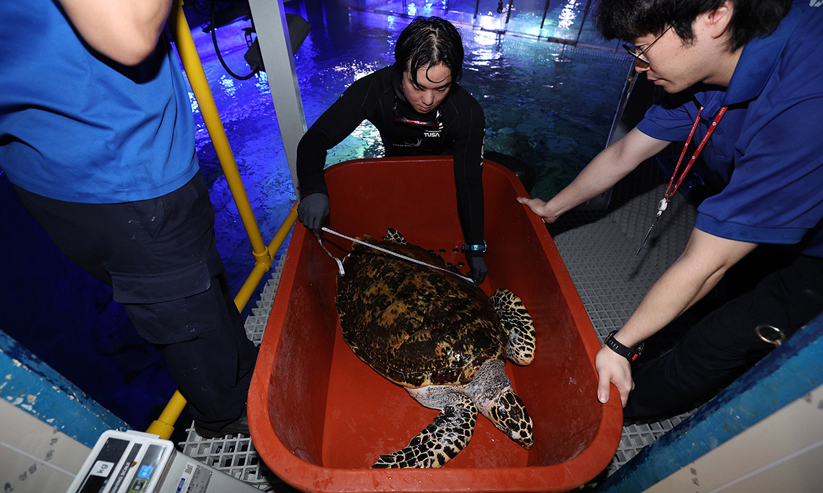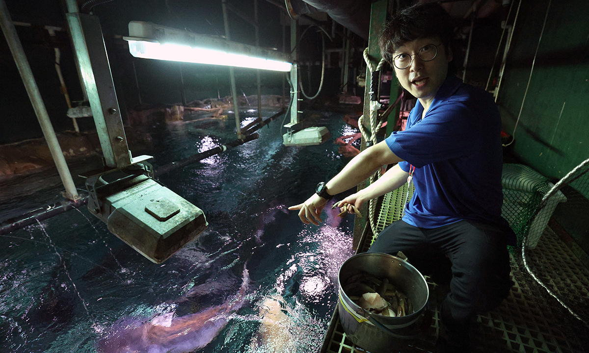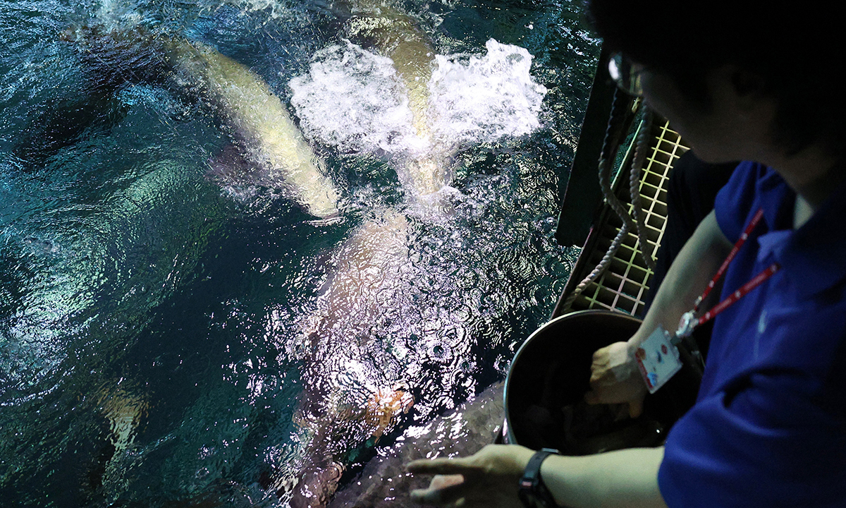 아쿠아리스트는 계단을 통해 수조 위로 올라가 먹이를 던져줬다. “과식하면 물고기도 지방간 같은 성인병에 걸릴 수 있다. 야생에서처럼 항상 사냥에 성공하지 못하는 상황을 고려해, 포만감은 주되 부족한 듯 관리하는 게 건강에 좋아요”라고 말했다. 개체별 섭취량을 눈으로 확인하는 것도 아쿠아리스트의 중요한 역할이다.