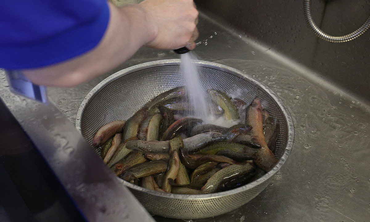 열대우림터널에서는 세계 최대 담수어 피라루크가 관람객의 시선을 사로잡는다. 총 4마리의 피라루크가 있다. 처음에는 30㎝ 크기로 아쿠아리움에 들어왔지만, 어느새 150㎝까지 자랐다. 어류 생태 담당 허범석(34) 아쿠아리스트는 이날도 팡가시우스(메기)와 냉동 미꾸라지를 손질하느라 바쁘다. “먹이를 통째로 던져줘도 먹긴 하지만, 얼마나 먹었는지 직접 확인해야 해요. 그래서 입 크기에 맞게 잘라주고 영양제도 넣습니다. 냉동 미꾸라지를 줄 때는 해동 후 점액질을 완전히 제거해야 소화 장애를 예방할 수 있습니다”라고 말했다.