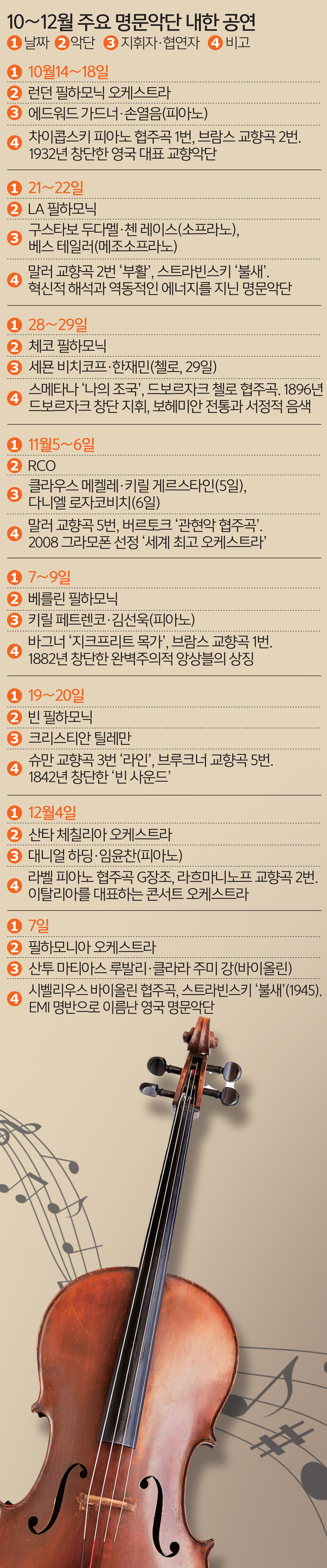 올 가을 한국 클래식 무대가 역대급으로 화려하다. 런던필하모닉을 시작으로 베를린 필하모닉, 빈 필하모닉, 로열 콘세르트헤바우 등 세계 정상급 오케스트라들이 잇따라 내한한다. 그 수가 열세곳에 달하는데 모두 전통과 명성, 실력과 개성에서 정상급으로 손꼽히는 악단들이다.