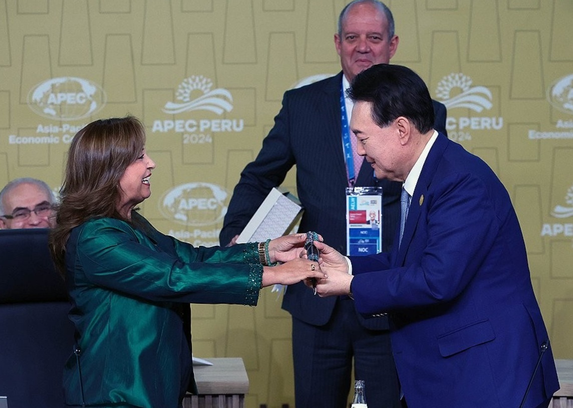 한·중 정상의 만남만큼은 아니지만 한·페루 정상회담도 나름 눈길을 끌었다. 정부는 양국이 잠수함 공동 개발 등 방산 협력 가속화에 합의했다고 대대적으로 홍보했다. 2024년 에이펙 의장국이 개최국인 페루이듯 이듬해인 2025년 경북 경주에서 열릴 에이펙은 한국이 의장국 자격으로 주최할 예정이었다. 회의 마지막 날 디나 볼루아르테 페루 대통령은 윤 전 대통령에게 페루 전통 양식으로 만든 의사봉을 전달했다. 에이펙 차기 의장국인 한국의 성공적인 회의 개최를 기원하는 뜻이 담겼다. 의사봉을 받아든 윤 전 대통령은 “에이펙 회원국 정상들 간의 만남이 아시아태평양 지역을 더욱 연결되고 혁신적이며 번영하게 만들 것”이라고 포부를 밝혔다.