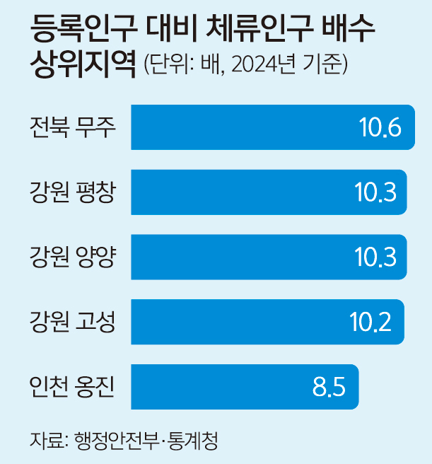 생활인구가 높은 지역은 대부분 관광지다. 행정안전부가 올 5월 발표한 ‘2024년 3분기 생활인구 산정 결과’ 보고서를 보면 지역인구 대비 생활인구가 가장 높은 배수로 나타난 지역은 강원 양양, 경기 가평, 강원 평창 등 주요 관광 명소에 몰려있다.