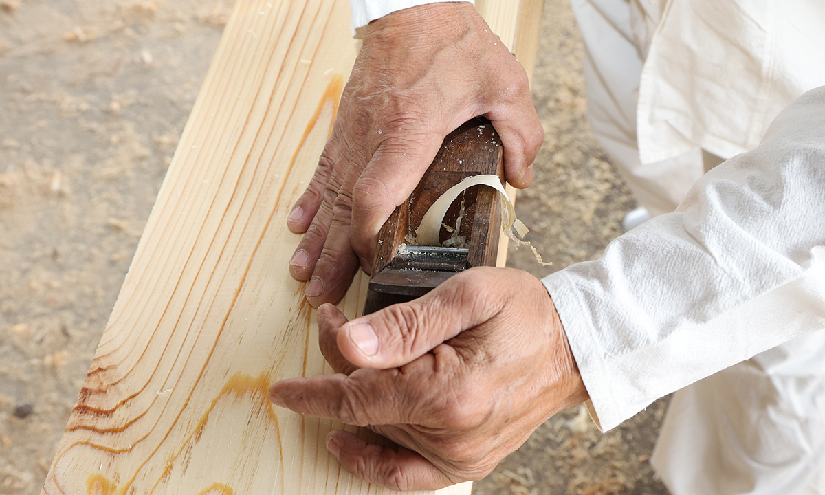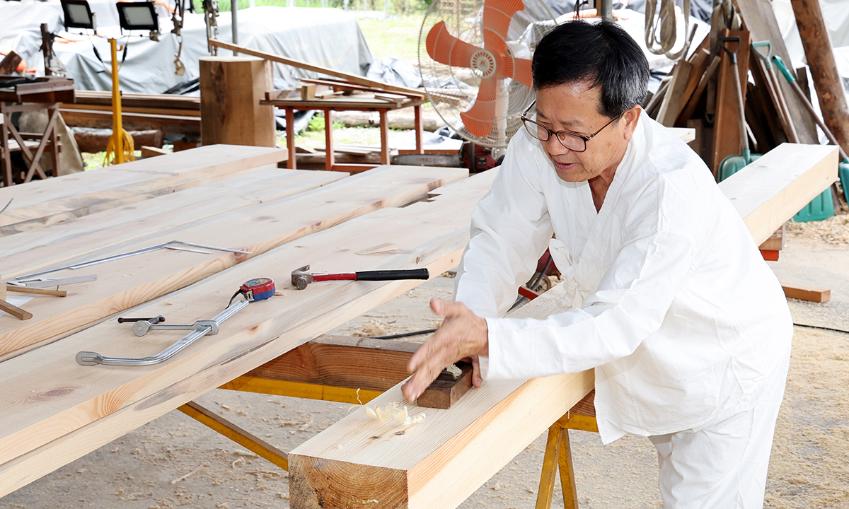 충청북도 무형 유산 제23호 대목장(大木匠) 기능보유자인 이연훈 대목장이 새로운 작업에 쓰일 목재의 대패질에 구슬땀을 흘리고 있다.