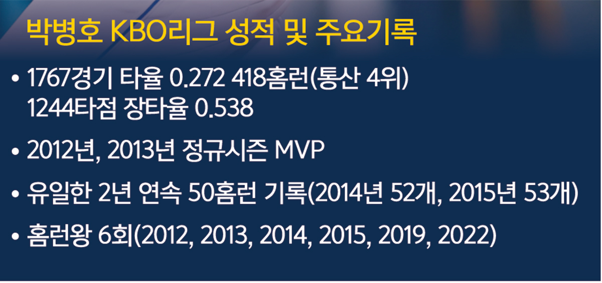 박병호는 지난 3일 전격 은퇴를 발표했다. 삼성과 계약이 끝나고 자유계약선수(FA) 신분을 앞두고 있어 친정 키움이 영입을 고려 중이었지만 떨어진 기량에 미련 없이 은퇴를 선언하고 키움의 잔류군 선임코치가 돼 지도자로 변신하는 길을 택했다. 박병호가 남긴 역사도 엄청나다. 2005년 LG 유니폼을 입고 KBO리그에 데뷔해 넥센(현 키움)을 거쳐 KT와 삼성에서 뛰면서 1767경기 타율 0.272 418홈런 1244타점 장타율 0.538의 기록을 남겼다. 418홈런은 최정(SSG·518개), 이승엽(467개), 최형우(KIA·419개)에 이어 통산 4위에 해당한다. 리그에서 유일한 2년 연속 50홈런 기록(2014년 52개, 2015년 53개)도 가지고 있다. 2012년과 2013년 2년 연속 정규시즌 MVP를 수상했고 홈런왕도 역대 최다인 6차례(2012, 2013, 2014, 2015, 2019, 2022)나 올랐다.