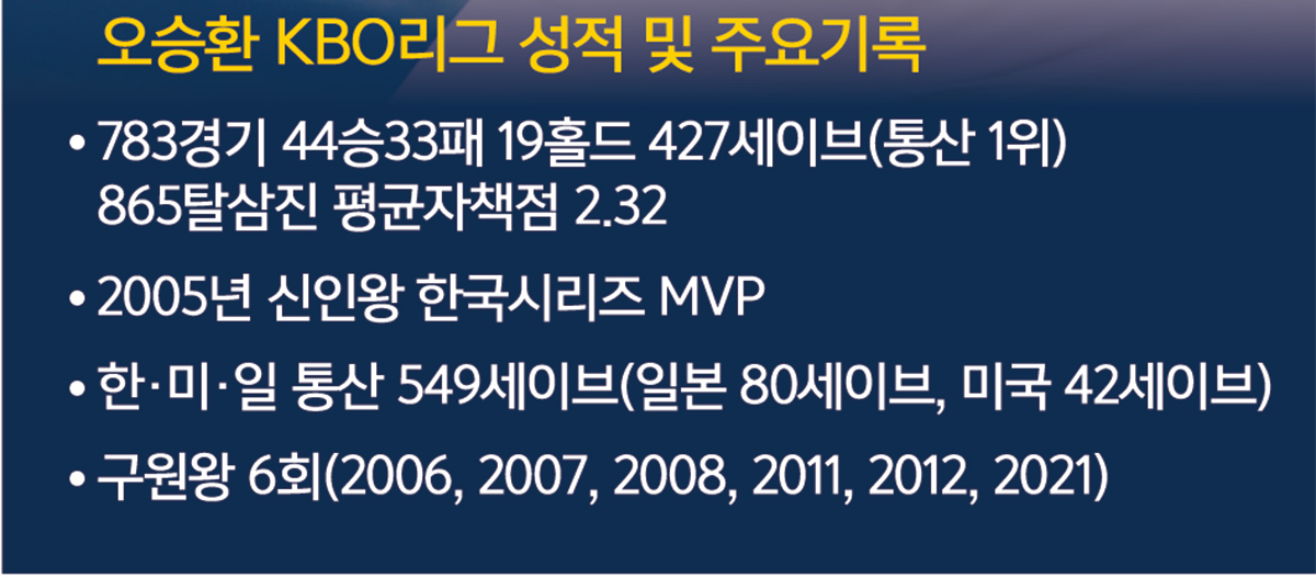 오승환이 KBO리그에 남긴 족적은 어마어마하다. 그가 가진 마무리 투수 기록은 당분간 깨지기 어려울 것으로 보인다. 2005년 데뷔한 오승환은 KBO에서 783경기 44승33패 19홀드 427세이브 865탈삼진 평균자책점 2.32의 성적을 남겼다. 2005년 신인왕에 이어 한국시리즈 최우수선수(MVP)에도 뽑혔다. 구원왕은 총 6차례(2006, 2007, 2008, 2011, 2012, 2021) 올랐다. 특히 427세이브는 통산 1위로 2위인 손승락(KIA 코치)의 271개에 크게 앞선다. 특히 일본프로야구에서 80세이브, 미국에서 거둔 42세이브를 합치면 통산 549세이브나 기록했다.