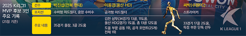프로축구 K리그1이 30일 열리는 최종 38라운드를 끝으로 2025시즌을 마무리하는 가운데, 올 시즌 그라운드에서 가장 빛나는 선수에게 주어지는 최우수선수(MVP)의 향방에도 관심이 쏠린다. MVP 최종 후보에 오른 박진섭(전북 현대)과 싸박(수원FC), 이동경(울산 HD)이 저마다의 강점을 앞세워 생애 첫 MVP 수상에 도전한다.