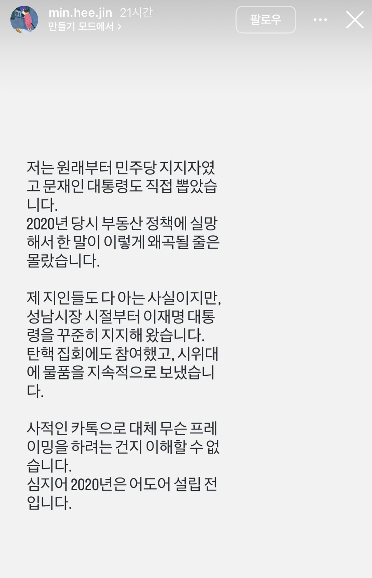 지난 28일 민희진 전 대표는 자신의 사회관계망서비스(SNS)에 “저는 원래부터 민주당 지지자였고 문재인 대통령도 직접 뽑았습니다”라면서 “2020년 당시 부동산 정책에 실망해서 한 말이 이렇게 왜곡될 줄은 몰랐습니다”라고 적었다.